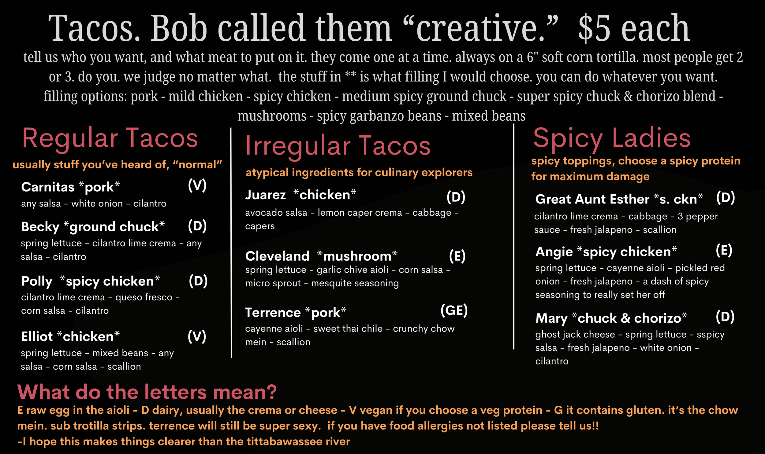 This is what we sell. There are many options, but not more than you can handle. Sometimes we neglect the updating of this menu, we don’t do it intentionally. Ask if you have questions, or stay curious.